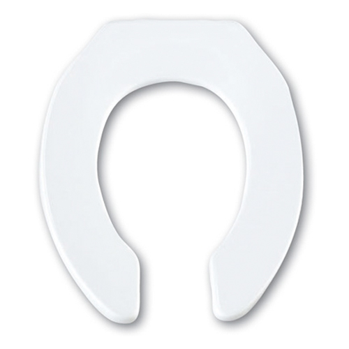 Asiento redondo de frente abierto para escusado de uso comercial, fabricado en plástico de larga duración con alto brillo en color blanco, bisagra check con sistema sta-tite, modelo 955CT, marca Bemis.