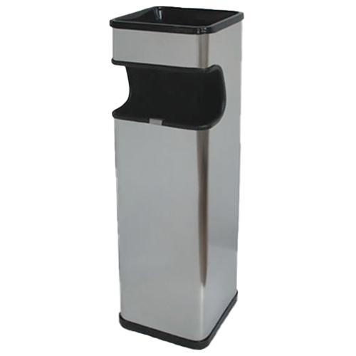 Basurero cuadrado con cenicero, fabricado en lámina electrocincada en pintura poliester en acero inoxidable, con protecciones plásticas en boca y fondo, dimensiones: 65 x 18 x 18 cm. Capacidad 18 litros, modelo BI70390, marca Jofel.