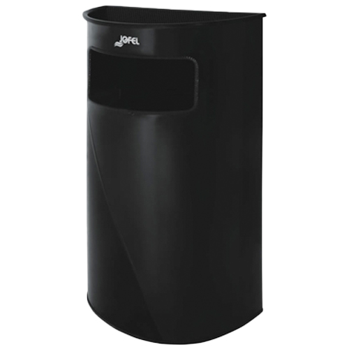 Basurero en media luna, de la línea Futura, en color negro, dimensiones de 850 x 490 x 255mm, capacidad de 45.5L / 12gl. Modelo BG88214, marca Jofel.