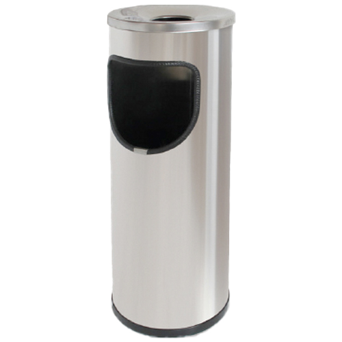 Basurero redondo con cenicero cromado, fabricado en lámina electrocincada, con protecciones plásticas en boca y fondo, acabado en pintura poliester en acero inoxidable, dimensiones: 66 x 21 cm. Capacidad de 13 litros. Modelo BI70290, marca Jofel.