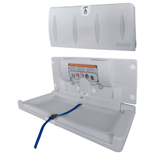 Cambiador de pañales horizontal, adecuado para baños públicos, terminado en color gris claro, dimensiones: 40 x 87 x 46 cm. (alto, largo, ancho), pesa 8 kilos, capacidad de 113 kilos, modelo AY10000, marca Jofel.