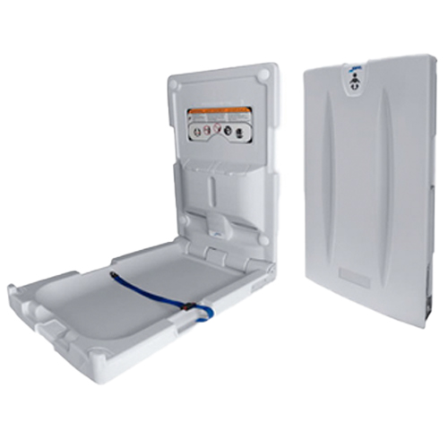 Cambiador de pañales vertical, adecuado para baños públicos, terminado en color gris claro, dimensiones: 88 x 50 x 88 cm. (alto, largo, ancho), pesa 10 kilos, capacidad de 113 kilos, modelo AY11000, marca Jofel.