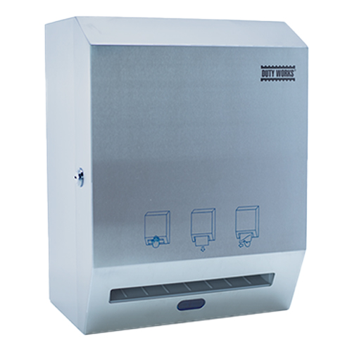 Funciona por medio de sensor infrarrojo que dispensa toalla de papel necesaria para secar las manos al momento de detectar el movimiento, evitando desperdicios.