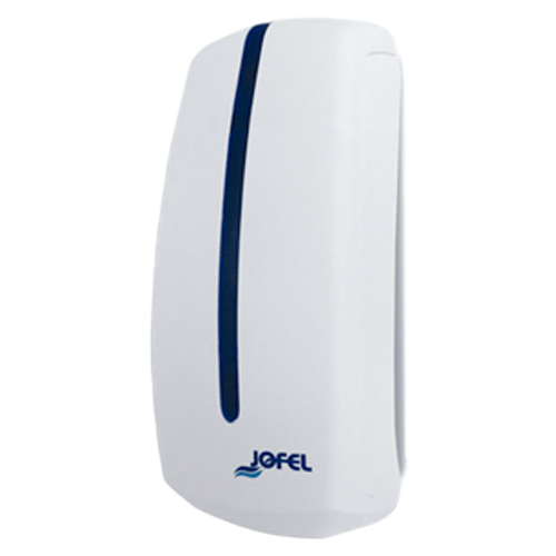 Dispensador bacteriostático, color blanco con aplique en azul, dimensiones de 256x98x100 (alto, largo, ancho), requiere de dos pilas alcalinas de 1.5V tamaño D, capcidad 500ml, modelo AI85000, marca Jofel.