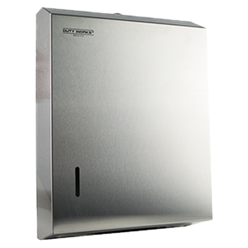 Fabricado totalmente en acero inoxidable, elegancia, higiene y alta resistencia es la construcción de este dispensador de toalla interdoblada de 28 x 37 x 10 cm (ancho, altura y profundidad), capacidad 600 toallas, con cerradura y llave, y rejilla para visualizar cuando recargar toalla. Modelo DW-72, marca Duty Works.