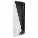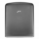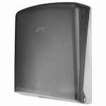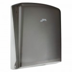 Dispensador de toallas interdobladas para manos, con cerradura de seguridad, fabricado en plástico ABS, cubierta en color humo transparente y base en color blanco, capacidad para 600 toallas.