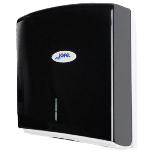 Dispensador Z Futura de toallas interdobladas para manos, con cerradura de seguridad, fabricado en plástico ABS color humo, capacidad: 600 toallas, dimensiones: 35 x 27 x 13 cm. Modelo AH35400, marca Jofel.