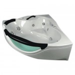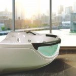 Esta bañera esquinera con hidromasaje, con su faldón de luneta de acrílico turquesa, le da a su hidromasaje un toque elegante y moderno. Innovador chasis tubular con suspensión y niveladores integrados. Línea Edition.