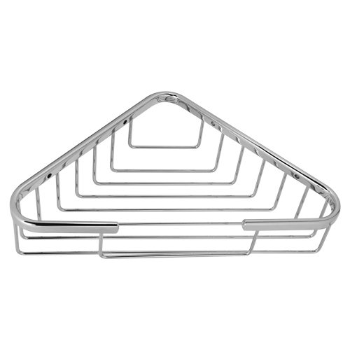Jabonera esquinera triangular de rejilla, borde superior reforzado, ideal para espacios pequeños aprovechando las esquinas, terminado cromado pulido.