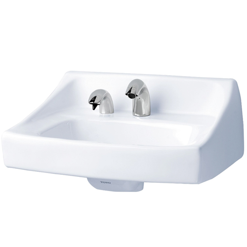 Lavabo comercial color blanco de montaje en pared con orificio para dispensador de jabón. Modelo LT307A#01, marca Toto.
