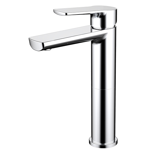 Monomando alto para lavabo, de la línea Lucent, acabado en cromo latón, cartucho cerámico europeo, aireador europeo anticalcáreo con restrictor de flujo de 8.3 LPM. Modelo TB 14.031, marca TecnoBath.