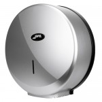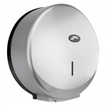 Portarrollos de papel higiénico con tapa en color plata, diseñado para instalarse en baños públicos.