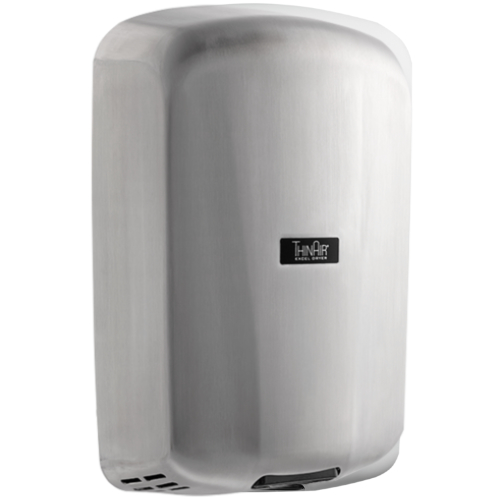La forma más delgada del recientemente mejorado secador de manos ThinAir. (acero inoxidable cepillado, completamente compatible con ADA, su perfil más delgado sobresale a menos de 4 pulgadas de la pared.
