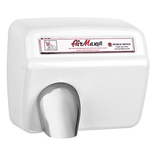 Secador de manos automático, operado por sensor de presencia, ofrece una alta resistencia al vandalismo. diseñado y fabricado especialmente para uso de alto tráfico de personas, aunado a un tiempo de secado dos veces menor que los convencionales. Modelo AirMax, marca World Dryer.