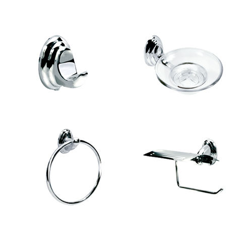 Set de 4 piezas de accesorios para baño terminado cromo, incluye percha, toallero de argolla, jabonera y portarrollo.