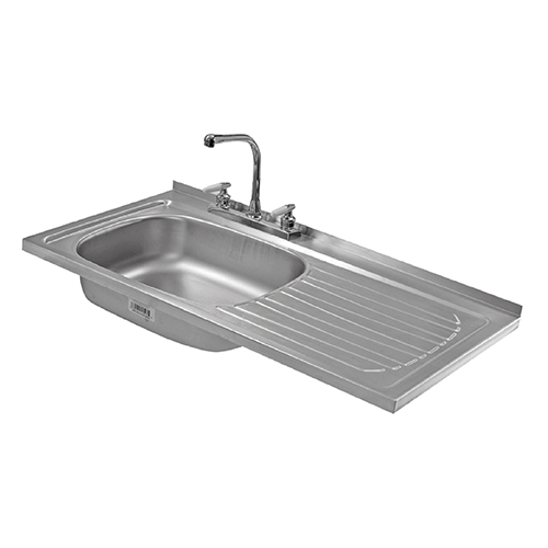 Tarja de acero inoxidable con escurridor derecho. Se puede empotrar a la pared o colocar sobre cubierta. Línea Calesa.